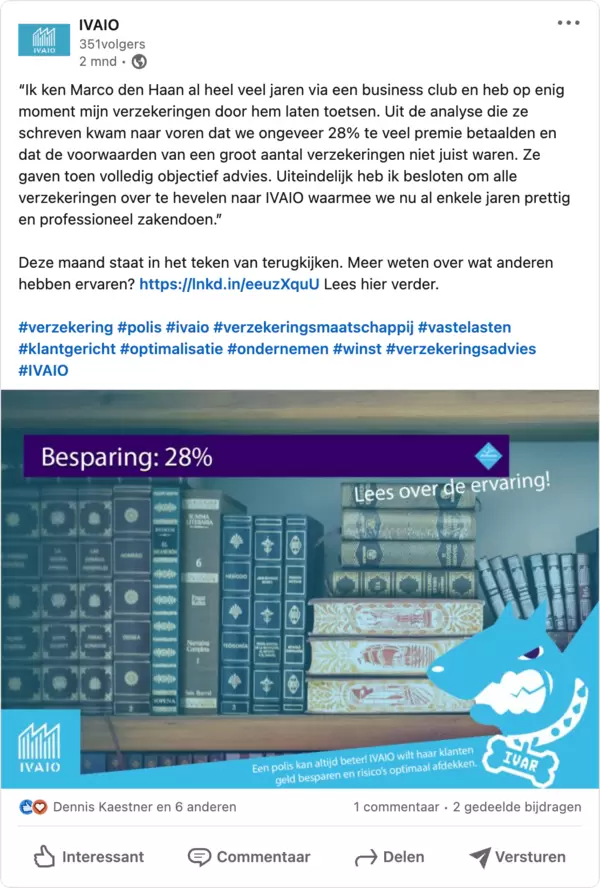 Als je de ondernemer spreekt, als je zijn LinkedIn pagina bekijkt en als je een animatie van de ondernemer ziet. Overal moet een (potentiële) klant hetzelfde gevoel krijgen bij het bedrijf. Het verhaal van IVAIO hebben wij doorgevoerd in een mooie uitleg animatie en een stevige LinkedIn campagne die elke week bijgehouden wordt.